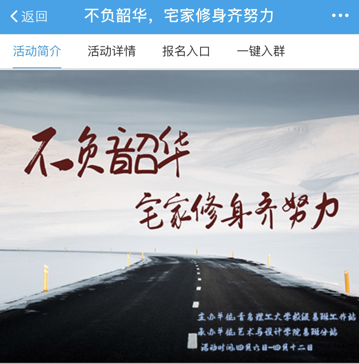 为推进校园文明建设,引导学生养成健康文明的生活习惯和行为方式,全面提高学生自身素质与修养,由校易班发展中心主办、艺术与设计学院易班工作分站承办的“文明修身月”主题活动之“不负韶华,宅家修身齐努力”线上分享评选活动于4月20日落下帷幕。