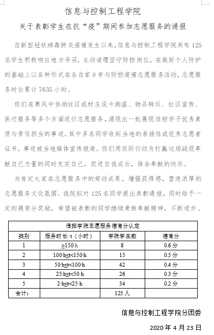 切实把大学生疫情防控志愿服务表现作为思想政治教育的重要抓手。学院全面统计参加疫情防控志愿服务工作的学生信息。经全院范围内摸排与审核,学院对参与志愿服务的125名同学提出表彰通报,并给予一定的德育分奖励,肯定学生在志愿服务中的劳动成果,增强获得感,体会奉献的快乐,营造浓厚的爱国、责任、担当、奉献的文化氛围。(撰稿:刘荣稳;审核:曲良波)