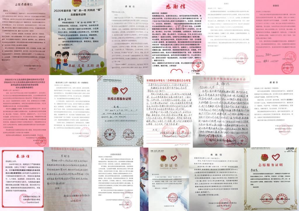 感谢信中还记录了一些真实具体的动人故事。中共莱西市水集街道办事处大疃村党支部来信记载了土木与建筑工程系土木工程专业1910班姜青林同学在身为党员的父亲带动下,父子上阵抗疫的故事,信中写到:“我村共产党员姜良家的儿子姜青林同志,在2020年春节期间,也就正月初二,听到他爸爸回家说抗击疫情共产党员要冲锋在前,便主动找到村党支部书记申请加入抗击疫情志愿者,每日按时到本村抗疫检查站协助工作,连续工作65天,在他的带动下不少青年加入了抗击疫情第一线。”梁山县大路口村党支部的来信记载了土木与建筑工程系工程监理专业182班学生张鑫鑫“自2020年1月27日(正月初三)以来,每天24小时值守本村防控点”,连续昼夜奋战在防控一线的感人事迹。