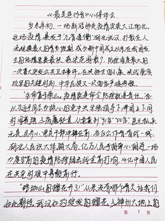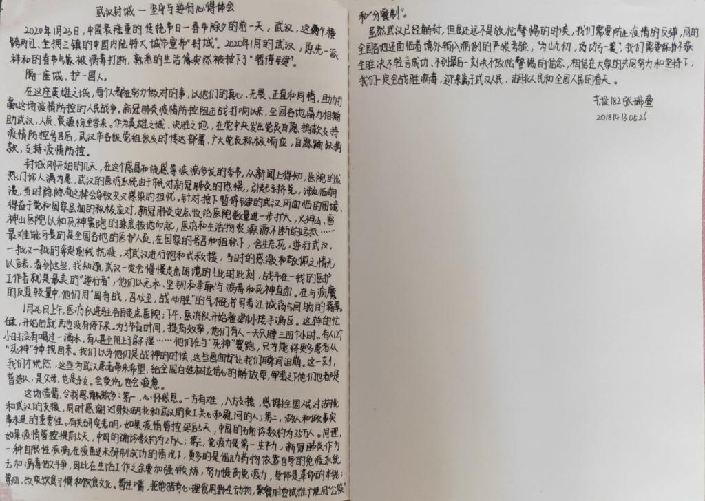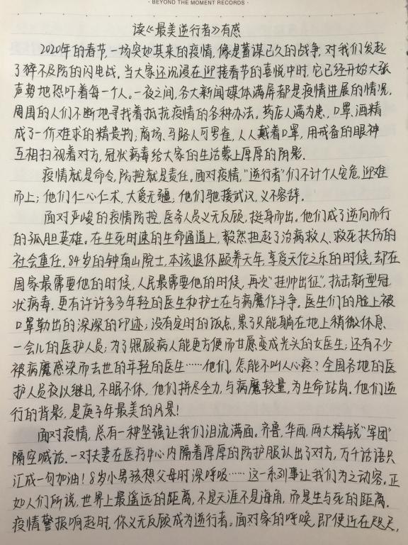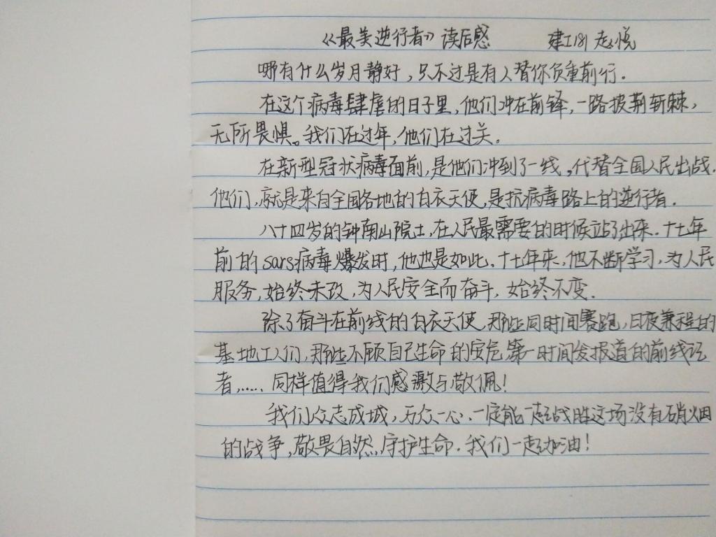 建工181班赵悦在阅读《最美逆行者》后写到:哪有什么岁月静好,只不过是有人替你负重前行!在这个病毒肆虐的日子里,他们冲锋在前,一路披荆斩棘,无所畏惧。我们在过年,他们在过关,在新型冠状病毒面前,是他们冲到了一线,代替全国人民出战,他们就是来自全国各地的自衣天使,是抗病毒路上的进行者,除了奋斗在前线的白衣天使,那些同时间赛跑日夜兼程的基地工人们,那让不顾自己生命安危第一时间发报道的前线记者....同样值得我们感激与敬佩!我们众志成城、万众一心,定能起战胜这场没有硝烟的战争,敬畏自然守护生命,我们一起加油!