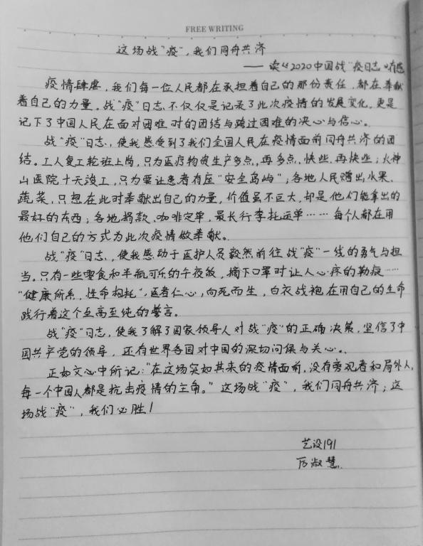 艺术191班厉淑慧在阅读《2020中国战“疫”日志》后写到:战“疫”日志不仅仅是记录了此次疫情的发展变化,更是记下了中国人民在面对困难时的团结与跨过困难的决心与信心。战“疫“日志,使我感受到了我们全国人民在疫情面前同舟共济的团结,使我感动于医护人员毅然前往战“疫“一线的勇气与担当,更使我了解了国家领导人对战“疫”的正确决策,坚信了中国共产党的领导,正如文中所记:“在这场突如其来的疫情面前,没有旁观者和局外人,每一个中国人都是抗击疫情的主角。”这场战“疫”,我们同舟共济,这场战“疫”,我们必胜!(撰稿:孙浩佳、宋晓峰;审核:范晓光)
