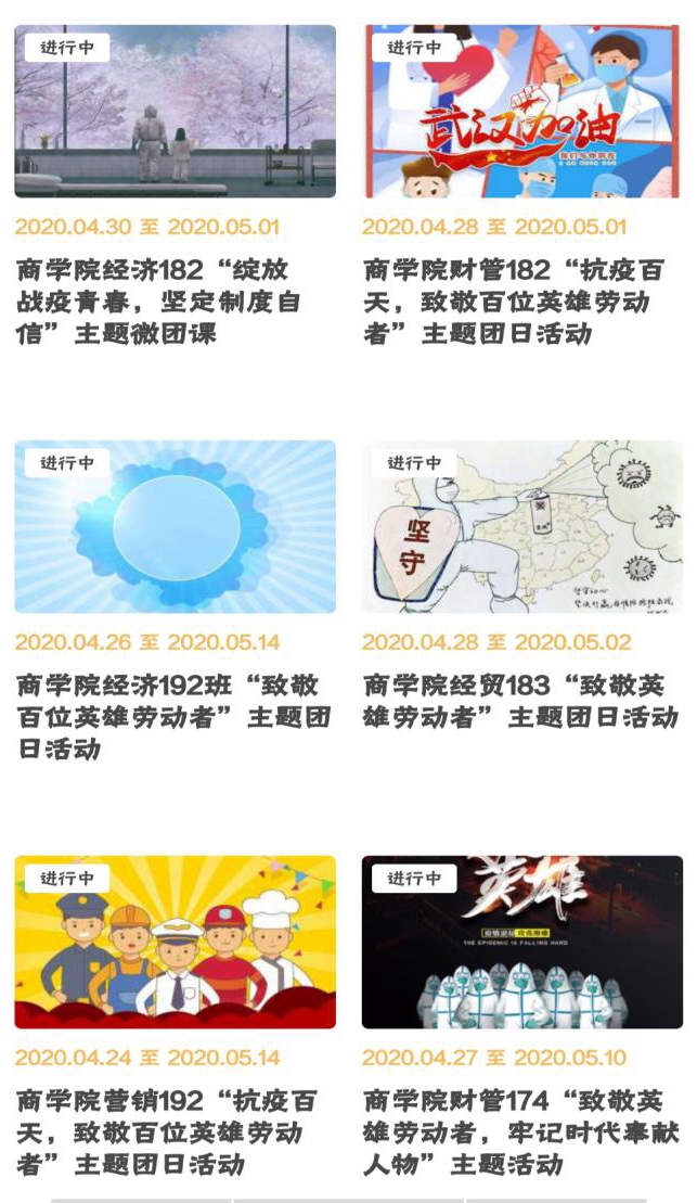 为弘扬劳动精神,商学院分团委举办“抗疫一百天,致敬百位英雄劳动者”主题团日活动。活动中,商学院每一个团支部都行动起来,组织班级同学线上推荐不同职业劳动者并开展劳动者事迹宣传学习。商学院分团委则在各团支部提交劳动者事迹基础上,整合、评选出包括党员干部、医务人员、人民警察、人民教师、建筑工人、快递小哥等在内的100位英雄劳动者,并通过商学院微信公众号“商说商道”开展100位英雄劳动者事迹宣传学习。