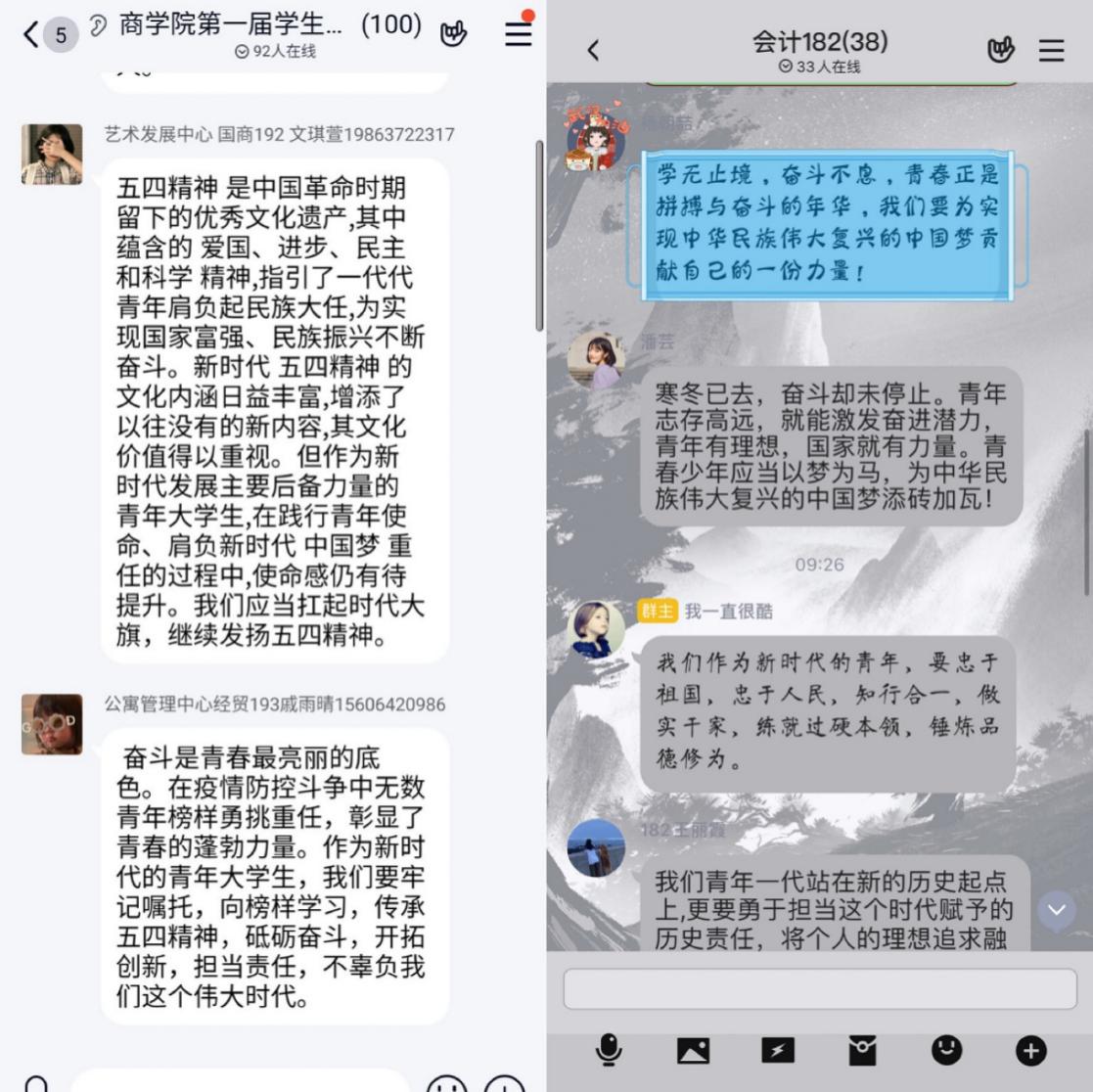 通过线上认真学习和热烈讨论,商学院青年师生纷纷表示,自己将牢记信件精神,向抗疫志愿者学习,于己担责、于国担当,传承五四精神,为社会发展、民族复兴、母校繁荣贡献源源不断的青春力量!(撰稿:薛诚、刘诗琪;审核:董兰国)