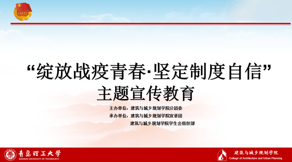 为深刻纪念五四运动,进一步团结、凝聚全院广大青年“爱国、进步、民主、科学”的“五四”精神,贯彻落实团省委《关于在五四期间组织开展“绽放战疫青春·坚定制度自信”主题宣传教育实践活动的通知》。建筑与城乡规划学院分团委组织部组织“绽放战疫青春,坚定制度自信”抗疫宣讲教育实践活动。此次宣讲活动由团支书带领各班全体同学以视频会议的形式观看宣讲视频完成。