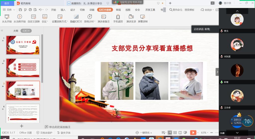 首先,由彭雪、胡兴卓、魏勇豪三位同学分享了观看山东省援鄂医疗队事迹直播的感想。支部党员彭雪分享到:印象最深刻的是冯护士的那句“妈妈我回来了”,令人泪目。医护工作者们为了节约防护服,节约时间,她们上班前不敢喝水,还穿上了纸尿裤,很多女同志还剪掉了长发,他们中的很多人和我们一般大,却在此次抗疫工作中做出了很大的贡献和牺牲,他们是真正的英雄。哪有什么岁月静好,不过是有人替你负重前行,疫情一步步向好的背后,都是她们的泪水和汗水的交织,是他们让这个漫长的寒冬充满了温暖,让我们能在春暖花开之际摘下口罩拥抱自然。胡兴卓说到:山东省援鄂医疗队3位同志讲述了奋战在湖北战“疫”一线工作中的点点滴滴,很多微小的细节都让我们很感动。李林俊,离开年幼的女儿,离开手术的母亲,奔赴一线;赵秀丽害怕母亲担心,隐瞒自己去援鄂的事情;96年冯晓彤是济南市最小的援鄂医疗队员,也主动请缨。印象很深的一句话是“那个时候,我是我,也不是我”。我们看到的是一种家国情怀,他们“舍小家,为大家"。 没有岁月静好,不过是有人替我们负重前行。作为青年党员,我们应该也在面对重大疫情、灾害等危机时有主动作为的奉献精神。