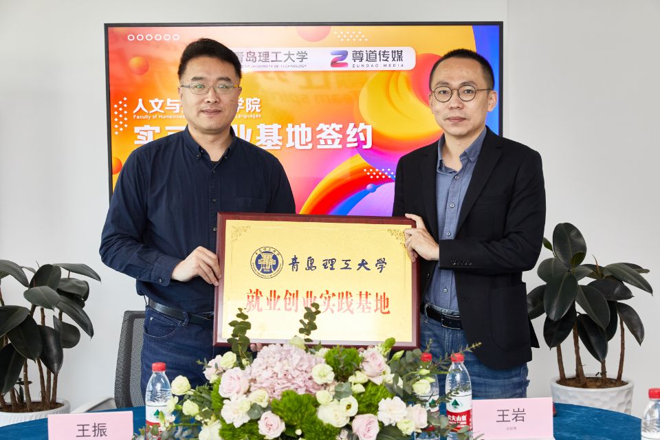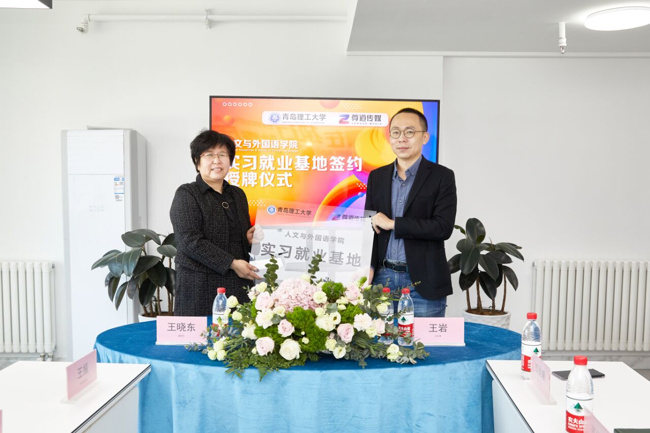 签约授牌仪式上,王岩介绍了青岛尊道传媒有限公司的基本情况和未来的发展蓝图。他认为,校企双方的合作有利于企业的发展,同时企业也需要引进更多高层次的人才,希望借助此次合作的契机,进一步拓展合作领域,形成校企双赢的格局。王晓东在讲话中谈到,学生实习就业基地的建立,是学院学科建设和人才培养的需要,也是学院服务社会的重要途径,不仅有利于满足学生参与实践、锻炼能力的需求,也有助于解决企业吸引人才、提升核心竞争力的难题,是高校和企业在新时代下合力培育创新人才、提升科研水平、实现产学研高效转化的有益尝试。随后,人文与外国语学院副院长王晓东、党总支副书记王振分别与王岩董事长签订实习、就业基地协议,并为青岛尊道传媒有限公司授牌“青岛理工大学人文与外国语学院实习就业基地”“青岛理工大学大学生就业创业基地”。