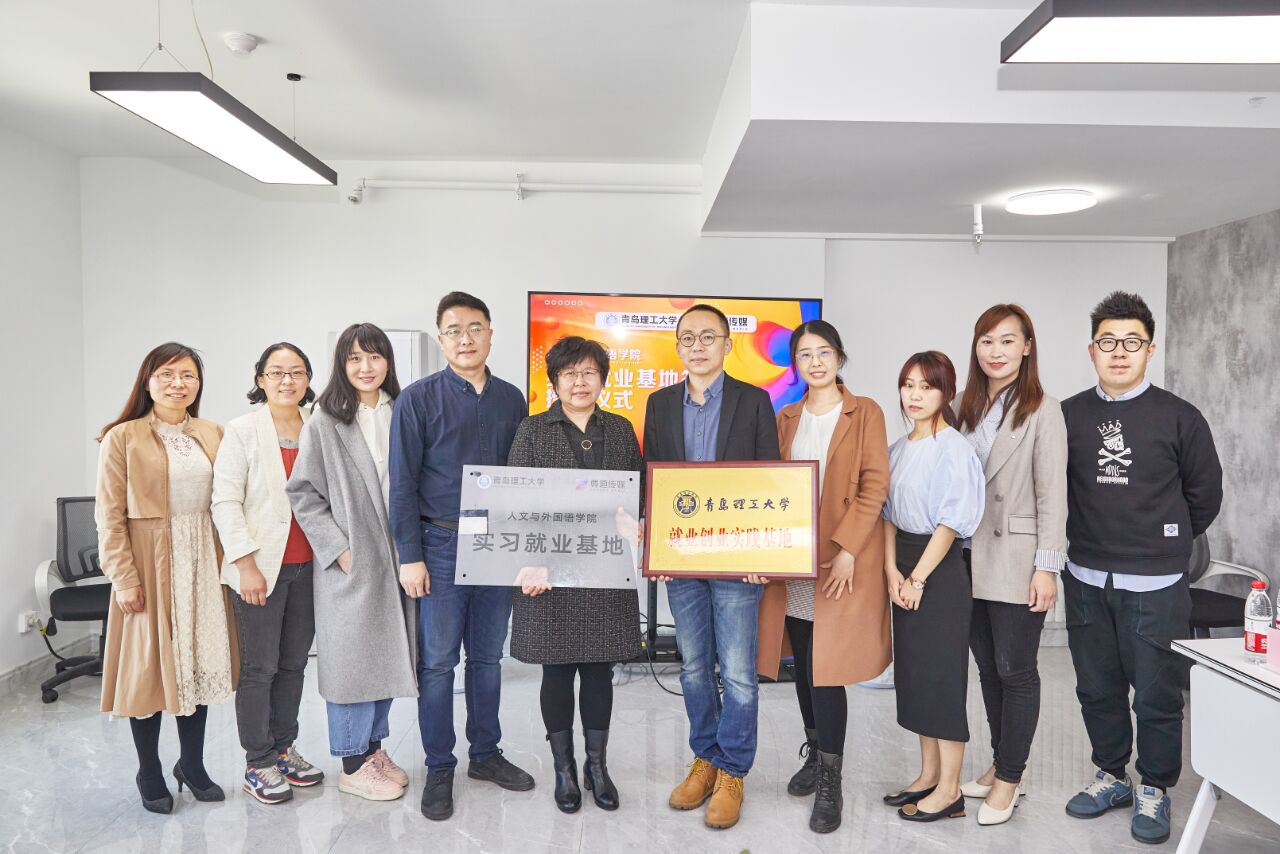 5月6日上午,我校人文与外国语学院实习就业基地签约授牌仪式在青岛尊道传媒有限公司举行。尊道传媒董事长兼总经理王岩、副总经理邵晨曦、营销总监邢伟绅,人文与外国语学院副院长王晓东、党总支副书记王振、广告学专业部分教师参加了签约授牌仪式。仪式由青岛尊道传媒有限公司人力资源总监陈庆贵主持。