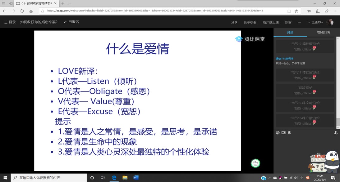 5月4日,主题线上情感讲座正式开始。信息与控制工程学院18级辅导员王超受邀作为主讲人出席活动。讲座伊始,王超结合自己的成长经历,以“如何收获你的婚恋幸福?”为题,引导同学们树立正确的恋爱婚姻观。讲座中,王超从纯真的爱情、幸福的婚姻、和谐的家庭三个方面对情感进行了全方面的解析,并对大学生普遍关心的,在情感中经常会出现的情况和问题进行了专业的分析与解答。同学们也积极参与线上互动和交流,课堂效果较好。讲座的最后,王超对本次活动进行了总结,并带领同学们共同学习了总书记对青年的青春寄语,勉励青年学生要知行合一,以青春奋斗响应总书记的亲切关怀和殷切期望。参加讲座的同学纷纷表示受益匪浅,不仅帮助我们树立了正确的恋爱婚姻观,更激发了我们前行的力量。