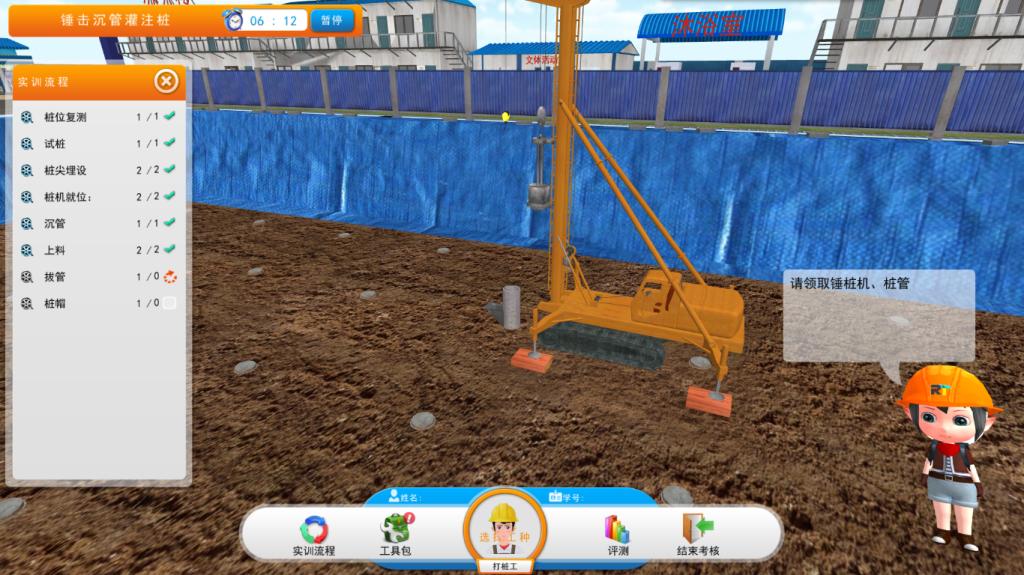 本次实习根据工程管理专业群的培养方案和实训特点设计为4周,分为“4D仿真施工工艺学习+3D在线测试、BIM-Film仿真现场交底比赛、建设项目综合岗位虚拟仿真实操”三个实习任务。实习中,学生既能通过虚拟仿真技术熟练各类典型施工工艺,也能利用BIM-PPT、BIM-Film等最新的建筑施工信息化工具进行仿真现场交底,并可在系统中扮演施工项目各类岗位角色完成相应岗位任务,体验施工项目管理流程。指导教师除了在岗位实操中扮演管理岗位角色,还可实时在线答疑。