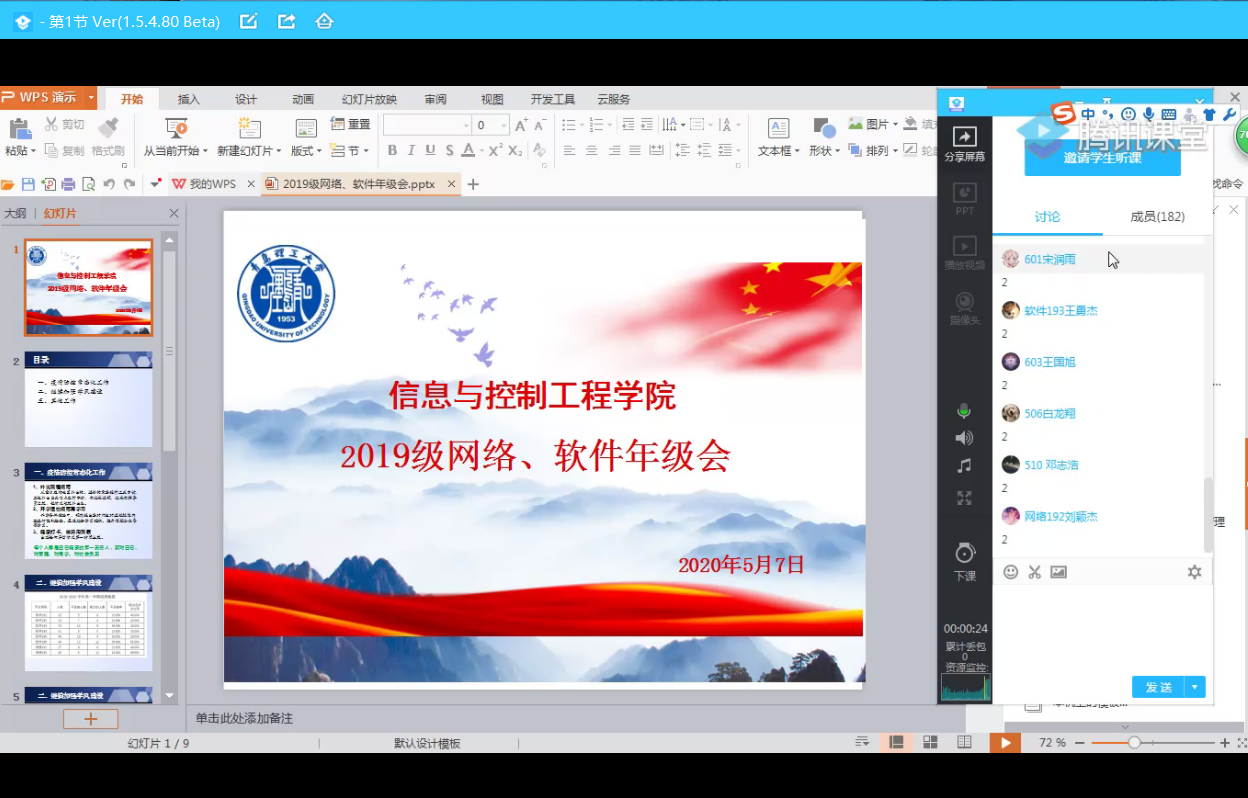为加强思想引领工作,常态化抓好疫情防控,促进线上学习学风建设,5月7日,信息与控制工程学院2019级网络、软件专业通过线上会议形式召开了年级会,相关专业全体同学参加,会议由辅导员逄超主持。