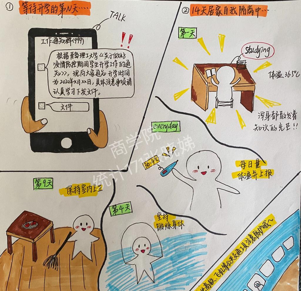 统计162班学生党员徐研是第一个报名参加培训活动的。“特别想念学校的一草一木,学校的防控演练视频和新闻我看了十几遍,每一幕都深深刻在了脑海里。我想用自己的画笔再次创作,既加深自己的印象,也给学弟学妹们提供一种生动有趣的形式来学习校园疫情防控常识”。徐研是一名标准的“学霸”,曾获得全国数学建模大赛山东赛区一等奖,而且在高中时就已通过素描十级考试。这次,她又亲手绘制了返校应知应会小漫画。