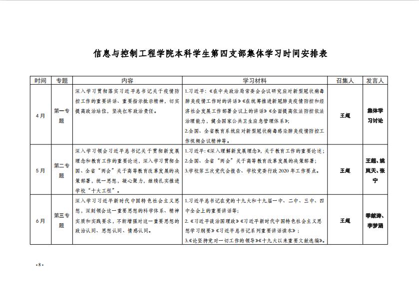 最后,王超对支部2020年度理论学习工作进行细致部署,充分调动支部全体党员学习的主动性和积极性,确保理论学习落到实处、取得实效。王超表示,根据《信息与控制工程学院党总支关于 2020 年理论学习中心组及教职工理论学习安排的意见》,支部结合工作实际,制定下发了《信息与控制工程学院本科学生第四支部关于开展 2020 年专题理论学习的通知》,通知对支部全年学习计划作了具体的安排,希望各位党员在思想上能够高度重视,在行动上能积极践行,要坚持个人自学思考与集体学习研讨相结合、理论学习与专题调研相结合、常规学习与在线学习相结合。为了规范党员政治理论学习制度,增强学习的针对性和实效性,支部将每月政治理论学习内容进行汇编成册,及时发到支部学习群中,方便党员线上线下学习。今后,支部将不断改进学习方法,加强党员教育、管理和服务,线下利用每次理论学习会结束后,开展特色“微感悟”分享活动;线上利用“学习强国”学习平台开展争做“学习标兵”活动,切实增强学习实效。