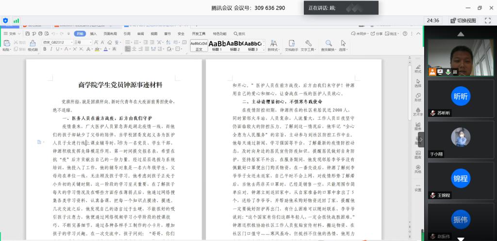 会上,王超带领党员共同学习了5个基层党组织、5名教工党员和2名学生党员的先进事迹材料,这些“抗疫榜样”是我们学习的典型,广大党员要以他们为榜样,不断汲取前行力量。王超表示,他们逆向而行,奋战在一线的精神令人钦佩,他们用自己的行动践行“不忘初心、牢记使命”。这场战“疫”,让我们更加体会到了“岂曰无衣,与子同袍”之情,更让我们学习到了无私奉献和勇于担当的精神。“抗疫榜样”的先进事迹激发了支部党员同志们不畏艰难、无私奉献的精神,引起了同学们深刻感想。