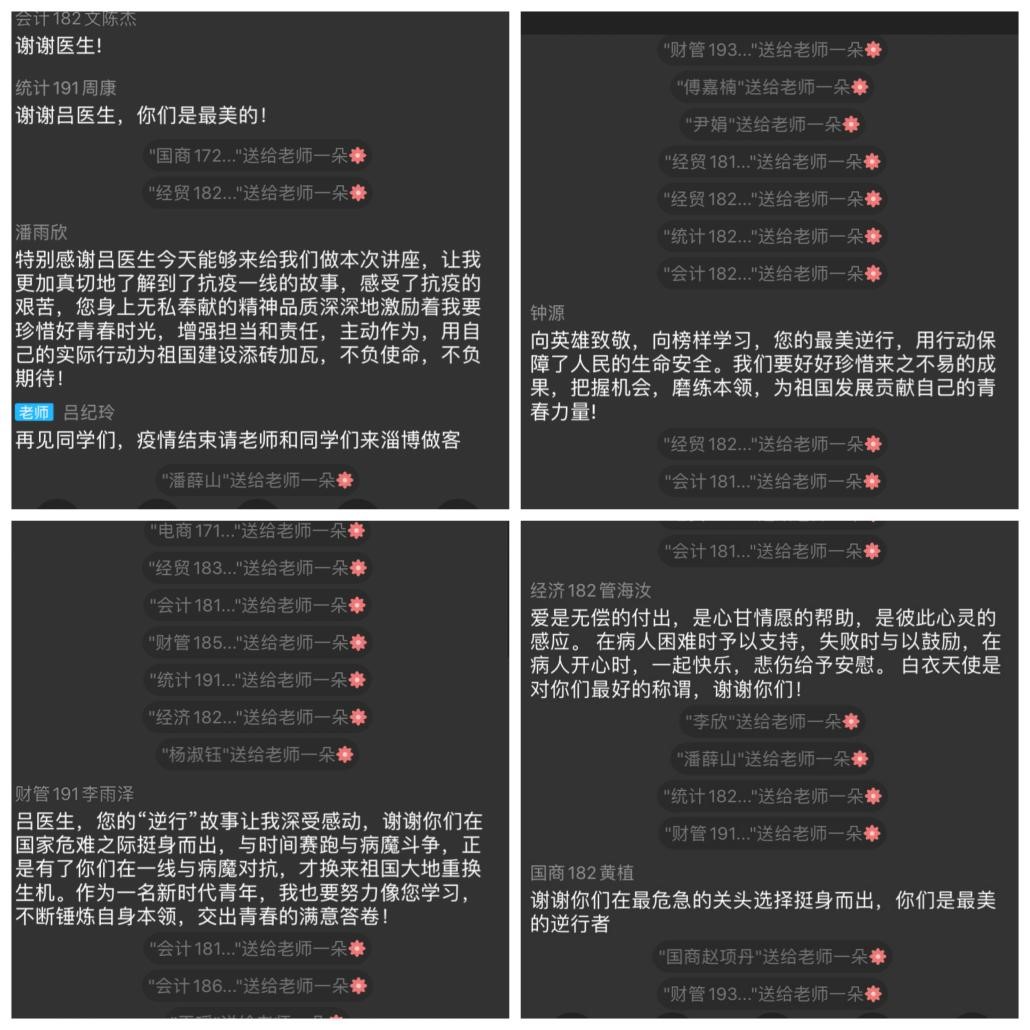 “向英雄致敬,向榜样学习。”讲座结束后,很多同学都饱含热泪,意犹未尽。来自武汉的李可心同学留言说:“您与病魔较量,与时间赛跑,将自己的生命置之度外,守护着湖北人民的安宁。感谢您无私无畏的付出,让家乡走出阴霾看到希望,未来的每一天我都将加倍珍惜,努力学习,砥砺前行!”会计181班潘雨欣留言表示:“特别感谢吕医生的倾情讲述,让我们真切了解到抗疫一线的故事和胜利的来之不易,您身上无私奉献的精神品质深深激励着我们要珍惜青春时光,主动作为、不负使命、不负期待!”