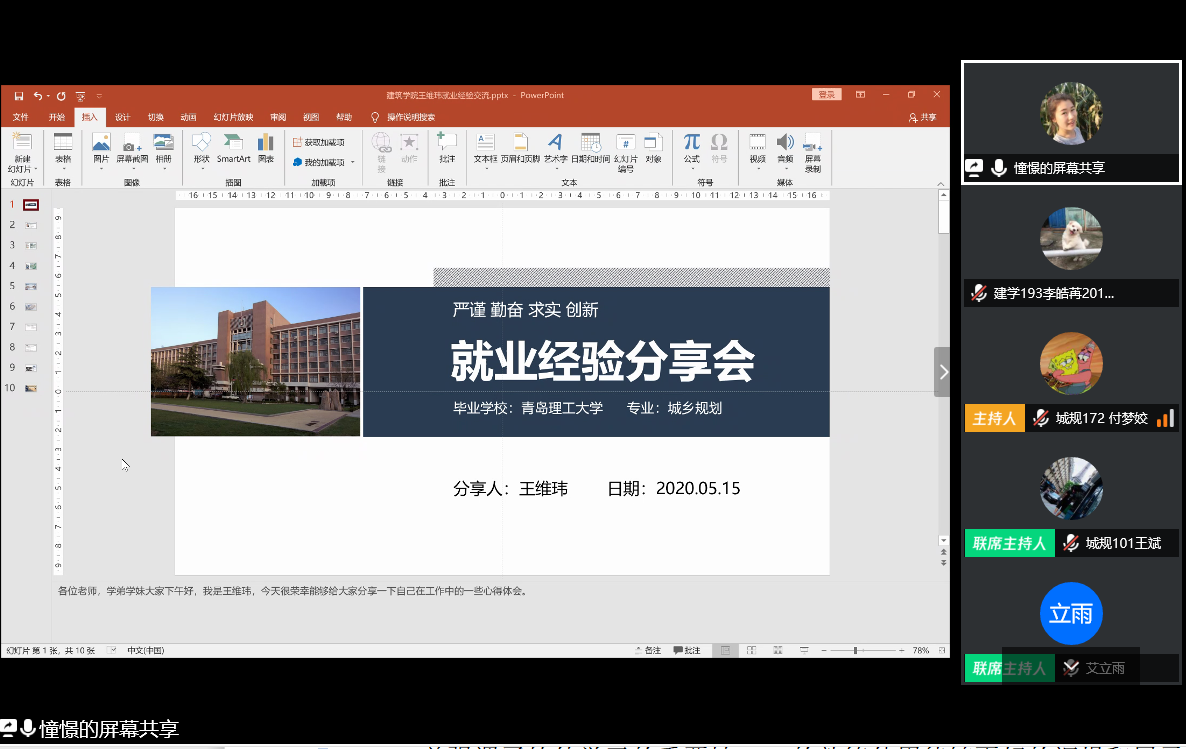 为帮助同学们增加对建筑行业的了解、明确自己的就业方向,在毕业生与在校生之间搭建了一个互动平台,充分发挥优秀毕业生的示范引领作用,近日,建筑与城乡规划学院通过腾讯会议举行X-talk系列讲座之城乡规划专业专场就业经验交流会。本次讲座由建筑与城乡规划学院党总支副书记高江主持。