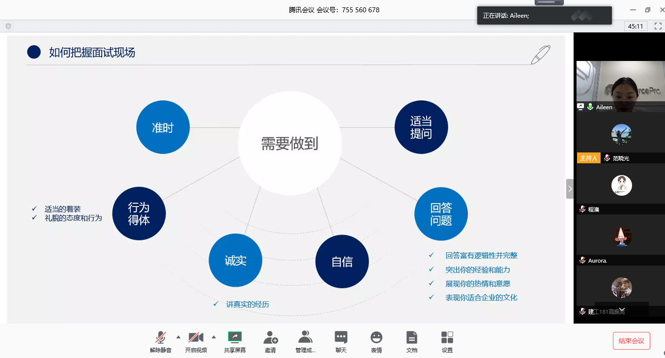 为帮助广大同学解决求职过程中遇到的疑难问题,熟知求职程序,提高求职面试能力,5月20日晚,高等职业学院邀请优创数据中国区招聘负责人、生涯规划师贾琳洁开设线上求职面试指导讲座,学院2020届部分毕业生及2018级学生参加。