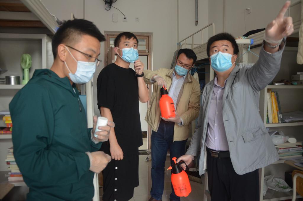 于利俊细心叮嘱同学们遵守学校防控要求,多洗手、勤通风、不串门、少聚集,切实做好自身防护,按时上报体温,与辅导员密切联系,出现问题及时上报学院,努力适应疫情形势下学生管理方式。他要求同学们高度重视宿舍卫生工作,保持宿舍清洁,保证每日消杀,亲自对学院配备的消杀用品使用方法进行示范,并嘱咐同学们尤其要注意门把手、爬梯、桌面等关键部位,务必确保宿舍安全。