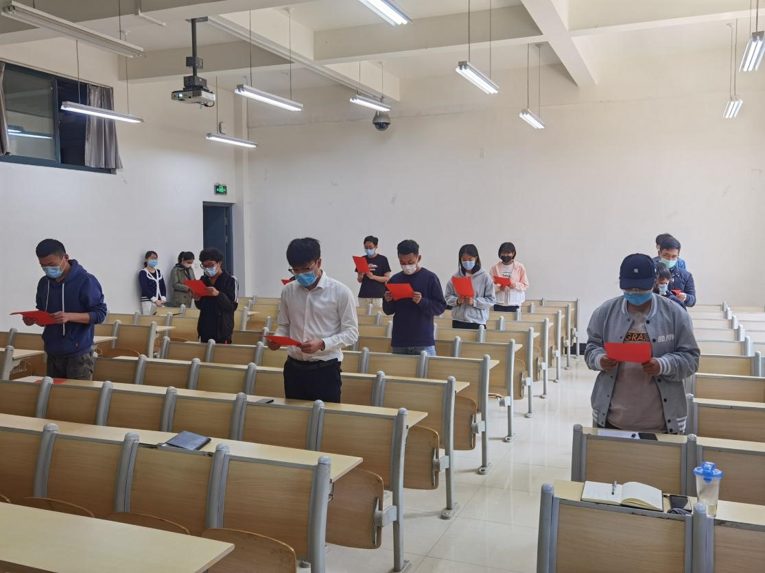 返校第一人领誓,商学院返校毕业生向全体学生发出倡议:班会中,理工学子纷纷表示中华民族抗击疫情的积极成果来之不易,他们励志把爱国情融入报国行,严格落实学校的各项防控工作,努力为自身搭建安全的校园生活环境,做有纪律、有思想、懂感恩的商院学子。商学院首位返校学生财管165班刘松岩带领所有返校学生郑重承诺: