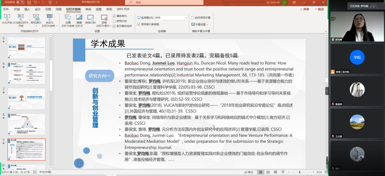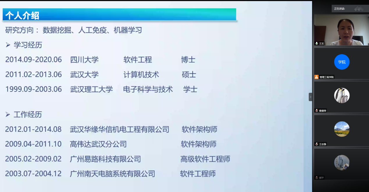 6月10日上午,管理工程学院举行疫情防控期间公开招聘博士第四次线上试讲,试讲由管理工程学院院长荀志远主持,党总支书记梁虹、教务处郭树峰、人事处闫惠刚、副院长申建红、赵辉、董德坤及各学科负责人等参加。评委们通过非现场接触方式的腾讯会议在各自的办公室收看了来自四川大学、吉林大学、哈尔滨工程大学等高校的4位博士的PPT课程讲授、科研成果及个人未来科研规划等,并在线提问答辩和师德考核。按照要求评委们从思政品德、教学技能、学术研究等方面对应聘博士进行了打分。