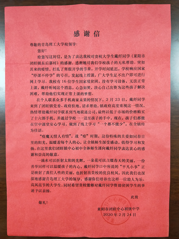 “疫魔无情人有情”,战“疫”时期,戴纤同学这份特殊的关爱如春日里的阳光,温暖着每个人的心,她的举动让全镇师生深受感动,她无私奉献的精神值得学习和发扬,莱阳市团旺中心初级中心向青岛理工大学寄出感谢信,表达对戴纤举动的赞扬和对青岛理工大学培养出如此优秀学子的感谢。