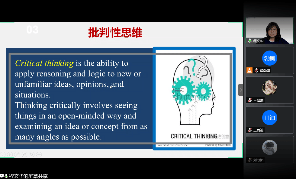 首先,程老师介绍了“批判性思维”这一概念,批判性思维是对他人观点和被认同的知识点所采取的主动的、持续的、仔细的思考进而达到对事物本质更为准确和全面认识的一种思维活动。然后程老师介绍了critical thinking的英文概念。