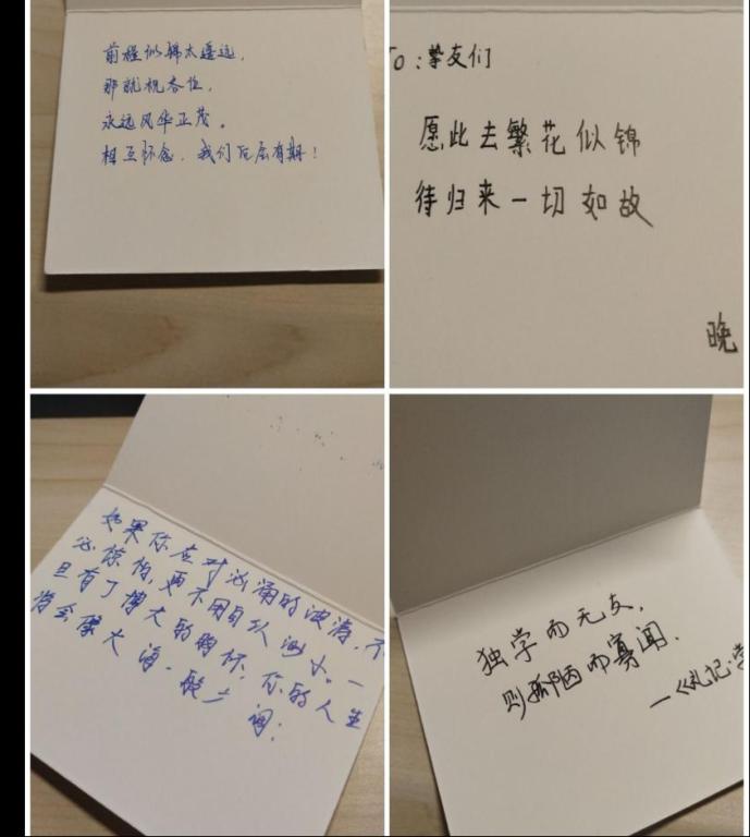 六月中的道别弥足珍贵,毕业临行前,学子心中必定会有万千感慨,希望对母校述说、与同学们表达、与学弟学妹分享。在“我想对你说”寄语活动中,毕业生将自己的毕业寄语、对母校的祝福、以明信片的形式进行抒发:“愿此去繁花似锦,待归来一切如故”“前程似锦太遥远,那就祝各位永远风华正茂,相互怀念,我们后会有期”……他们以在明信片中抒发情感的方式向母校告别,也为低年级的学生留下宝贵的建议。言语虽短,而毕业生们传达出的情谊却深,正如电影中所说“人生就是不断地放下,然而遗憾的是,我还没来得及与你们好好告别”,这一次,就让笔墨承载着期盼好好地与大学告别,再与未来招手。