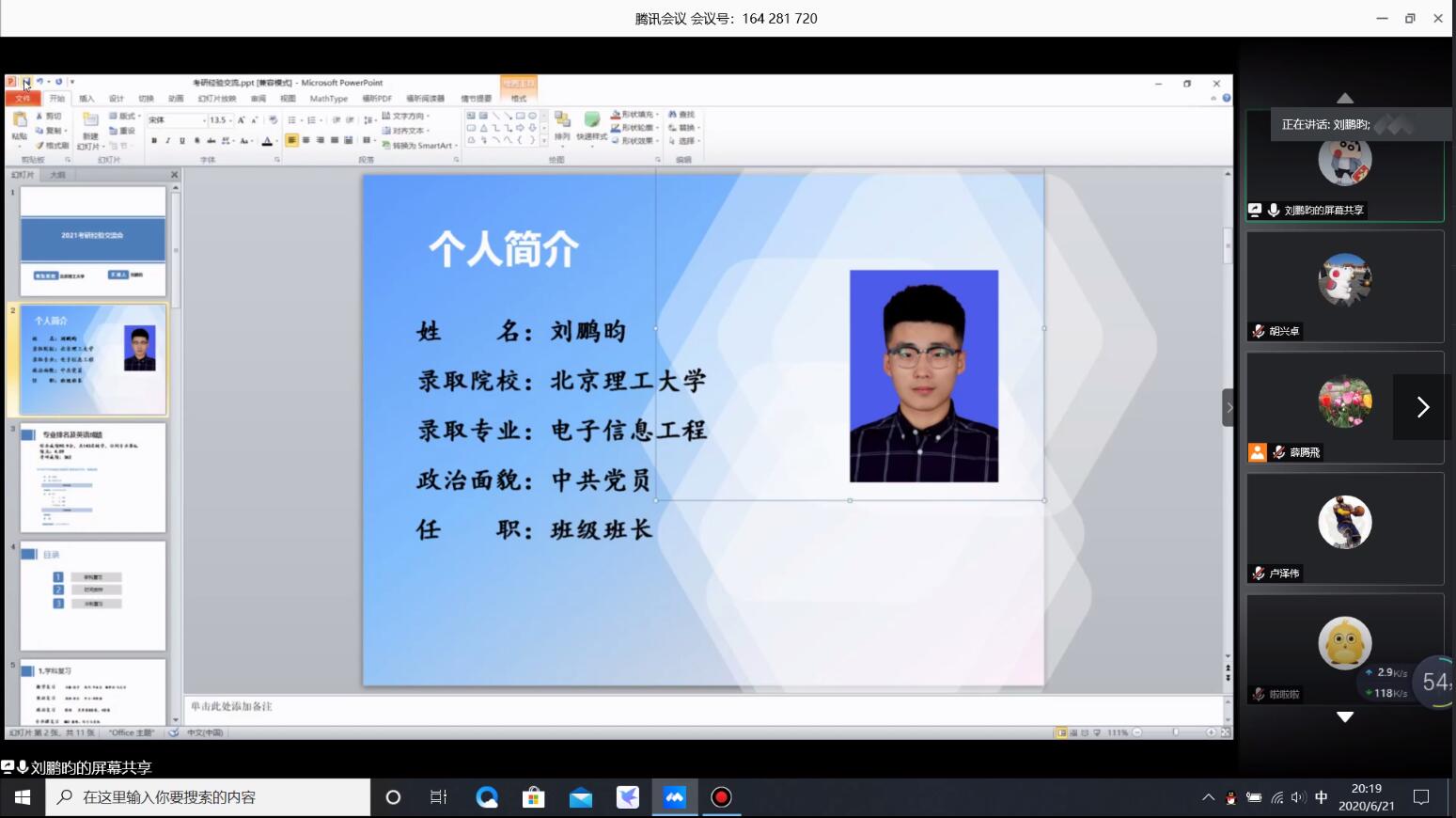 为提高学生考研热情,明确考研目标,掌握相关考研技巧,了解更多考研信息,2020年6月21日、22日晚,信息与控制工程学院邀请了八位2020届考研成绩优异的校友通过腾讯会议举行了通信工程、电子信息工程专业考研经验交流会,为有考研意向的2017级学生解疑答惑,交流并分享他们的考研经历与经验,交流会由辅导员薛腾飞老师主持。