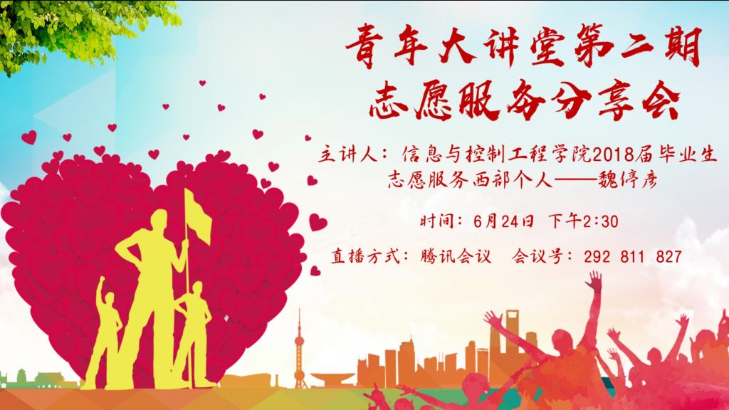6月24日下午,信息与控制工程学院分团委举行了青年大讲堂第二期——志愿服务西部线上分享会,会议邀请了学院2018届优秀毕业生、西部志愿服务优秀代表魏停彦主讲,学院分团委书记张英华和辅导员张丽参加,200余名学生线上聆听。