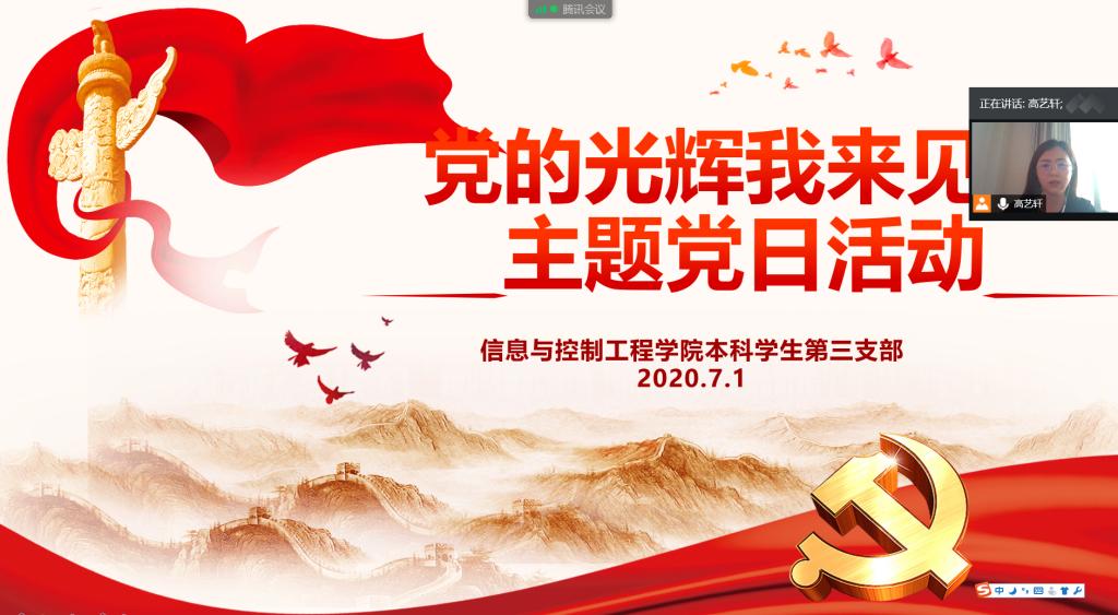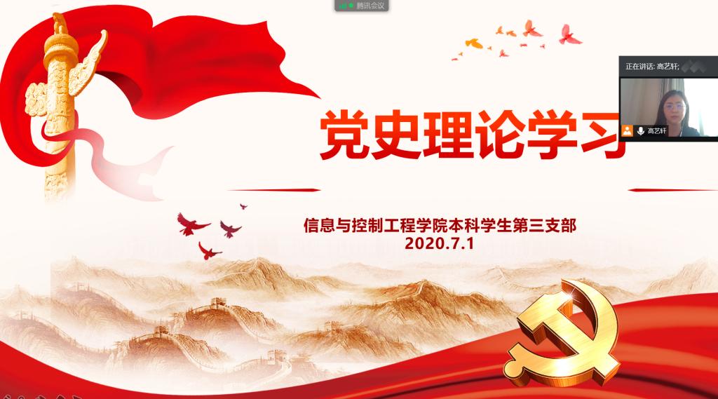 为庆祝中国共产党成立99周年,贯彻落实党的十九届四中全会精神,加强样板党支部建设工作,信息与控制工程学院本科学生三支部于7月1日上午召开线上支部大会,开展“党的光辉我来见证”主题党日活动,统一学习回顾中国共产党的发展历程与光辉印记。支部书记高艺轩主持,支部宣传委员薛腾飞、组织委员贾戈及支部党员和积极分子参与会议。