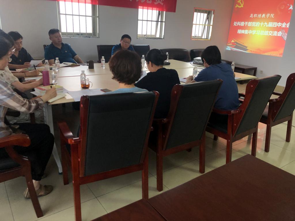 7月1日上午,高职继教学院在市北校区会议室组织学院十九届四中全会精神学习班学员进行集中交流研讨,学院党总支书记孟凡勇、院长施国盘和学习班全体学员、学院教工党员参加,学院党总支副书记范晓光主持交流研讨。