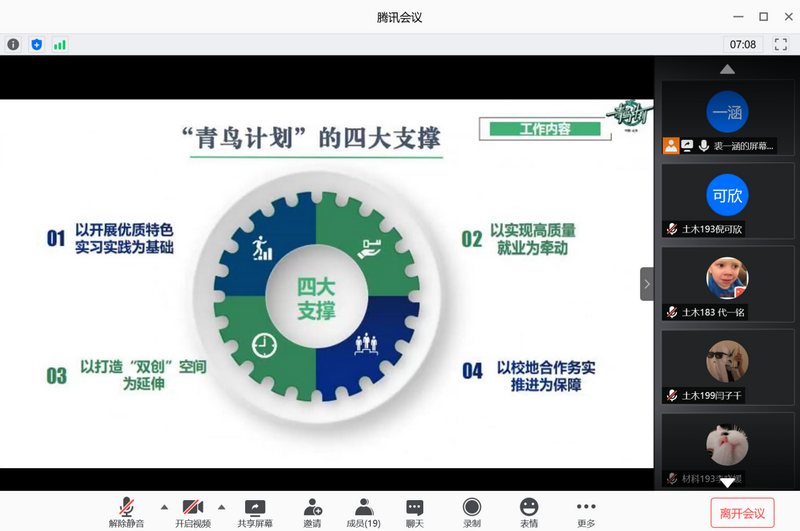 为进一步推进落实校团委关于“青鸟计划”工作的动员部署,引导学生利用“青鸟计划”这个平台返回家乡开展大学生岗位实习实践活动,7月6日,土木工程学院召开“青鸟计划”工作动员会,会议由土木198团支书裘一涵主持,学院2018级、2019级各班团支书参加动员会。