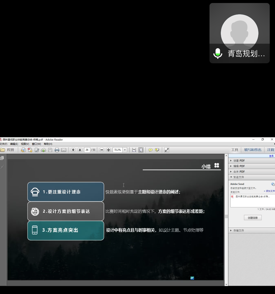 孔静雯通过对青岛市园林景观设计创意职业技能竞赛、山东省园林景观设计创意职业技能竞赛、青岛市“阳光社区2019”社区空间微更新活动三个竞赛的讲解向同学们展现园林规划的创意探索。展示了竞赛题目要求和设计分配时间,简单对题目进行了讲解。随后对竞赛做出小结:更注重设计理念,快题表现更侧重于主题和设计理念的阐述;设计方案的细节表达,在比赛时间相对充足的情况下,方案的细节表达不同将产生差距;方案的亮点突出,设计中有亮点且与时事相关,如设计主题、节点处理等。最后,王升歌对竞赛总结:首先要明确生态是基础,文化是核心。