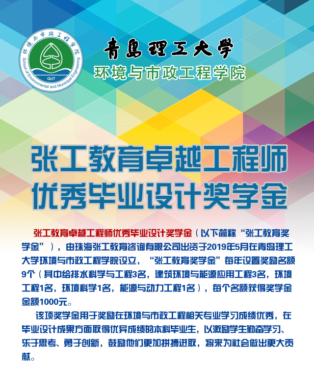 我校给排水83级校友张福先心系教育、情系母校,于2019年在青岛理工大学环境与市政工程学院设立“张工教育卓越工程师优秀毕业设计奖学金”,2019年共有9个毕业设计项目获得奖励,2020年又评出9个获奖优秀毕业设计,分别是给排水科学与工程专业3个:青岛市麦岛污水处理厂提标扩建工程设计(赵洋,毕学军教授指导)、青岛市黄岛区灵山卫排水区排水工程设计(孙文琳,苗群教授指导)、云南腾冲清水乡给排水规划设计(曹海燕,李金成副教授指导);建筑环境与能源应用工程专业3个:重庆某高校教学示范楼空调工程设计(孙德熙,季永明博士指导)、潍坊信圆金融服务中心1号楼空调工程设计(周腾德,崔红社副教授指导)、商丘城市广场空调设计(周思伟,刘国丹教授指导);环境工程专业的青岛某包装印刷厂废气中VOCs处理工艺设计(高燕,张宜升副教授指导),环境科学专业的多级A/O-MBBR工艺对微污染的去除研究(王慧敏,陈栋副教授指导),能源与动力工程专业的小型旋流燃烧器(航空用)的设计(李朝民,张敬奎副教授指导)。