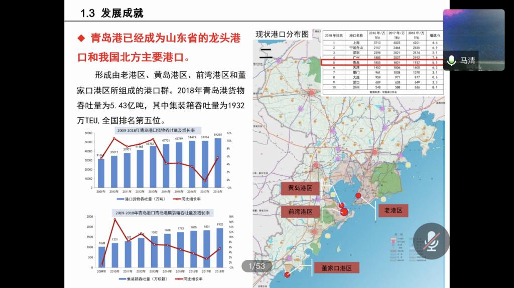 会议伊始,马清从青岛的历史沿革入手,对城市中海运、铁路、道路进行了基本介绍并表明了这三者对近代青岛的影响。随后,马清阐述了青岛老城区路网格局以及设计手法的街道特征,并向同学们展示了青岛市施行的都市计划,表明近代青岛市依托铁路海运港口的规划进行建设。马清进一步举例介绍了1970年以来东部新区的发展以及此后的胶州湾通道胶州湾隧道的建设。对1992年到2016年青岛城市轨道交通规划历程进行了详细的演示,表明城市轨道交通规划与不同发展时期的青岛市应与城市定位发展、战略相契合。此后,马清介绍了青岛近代以来的发展成就,阐明青岛特殊的地理位置特殊的关系对青岛市的影响。
