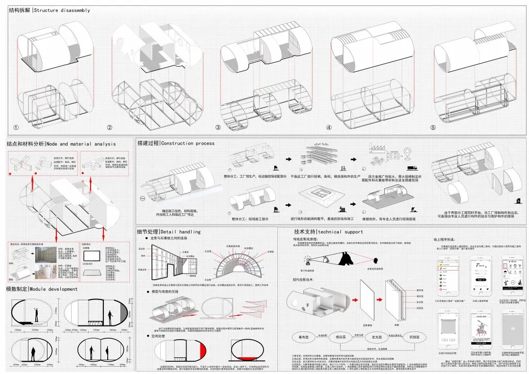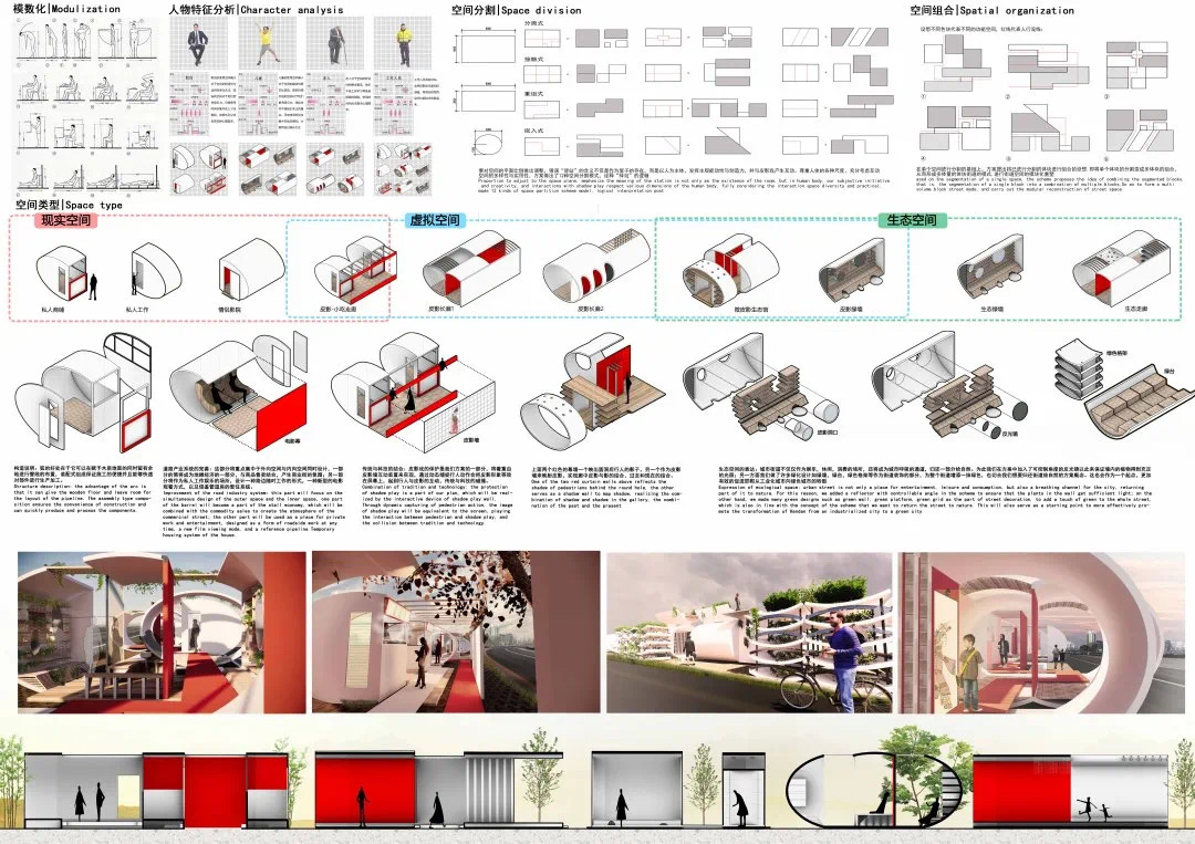 王文衡、成实、栾政山的“RADIAD街影设计”考虑到当今人口、建筑、功能高度集中,本该为日常生活服务的建筑逐渐脱离日常,符号化的建筑成为了城市的主体,人群成为了客观的剪影,压抑了主观能动性与创造力等现实问题。注重街道对于城市关联的桥梁作用,将“物质”、“虚拟”和“自然”空间的概念引入驿站。设计分为三大“空间”,“物质空间”服务于人们对不同空间功能的需求,“虚拟空间”以5G、全息投影等技术引入多元化的文化符号,“自然空间”通过空间要素一体化构建、生态环境要素的绿色智能设计和人工自然要素的智慧生态设计,实现绿色生态节能的空间需求。设计还通过墙面互动投影电子成像等技术与皮影结合,将皮影文化作为城市符号建筑与人之间的媒介,明确人在城市中的主体地位。
