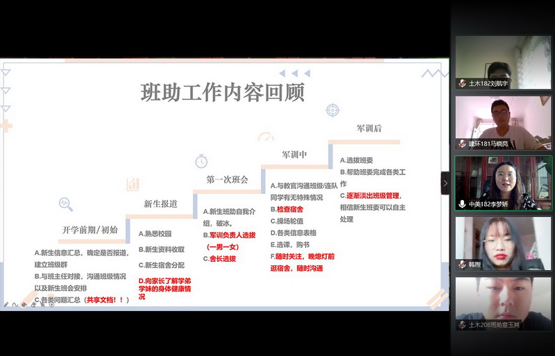 为做好2020级新生工作,加强学院2020级班助队伍建设,提升工作能力,8月14日上午,土木工程学院举办2020级班主任助理员线上培训会,学院党总支副书记邵先锋,学生工作办公室主任、分团委书记王中帅参加培训会,会议由辅导员李恺主持。
