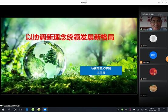 8月19日下午,“科普云端讲堂”第六讲开讲,主题为“以协调新理念统领发展新格局”,我校马克思主义学院讲师、历史学博士王玉喜老师主讲,马克思主义学院副院长任颖卮主持。