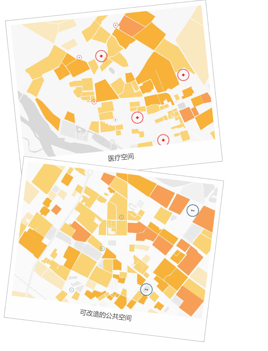 在居民对城市空间的需求的调查中,46.43%的居民反映城市医疗设施不足,39.29%的居民反映避难集散场所不足,同时在居民对社区空间管理上的建议的调查中,48.21%的居民反映社区医疗功能不齐全,43.45%的居民反映社区内居民活动空间不足,这与我们调研的方向和调研中发现的问题相吻合。