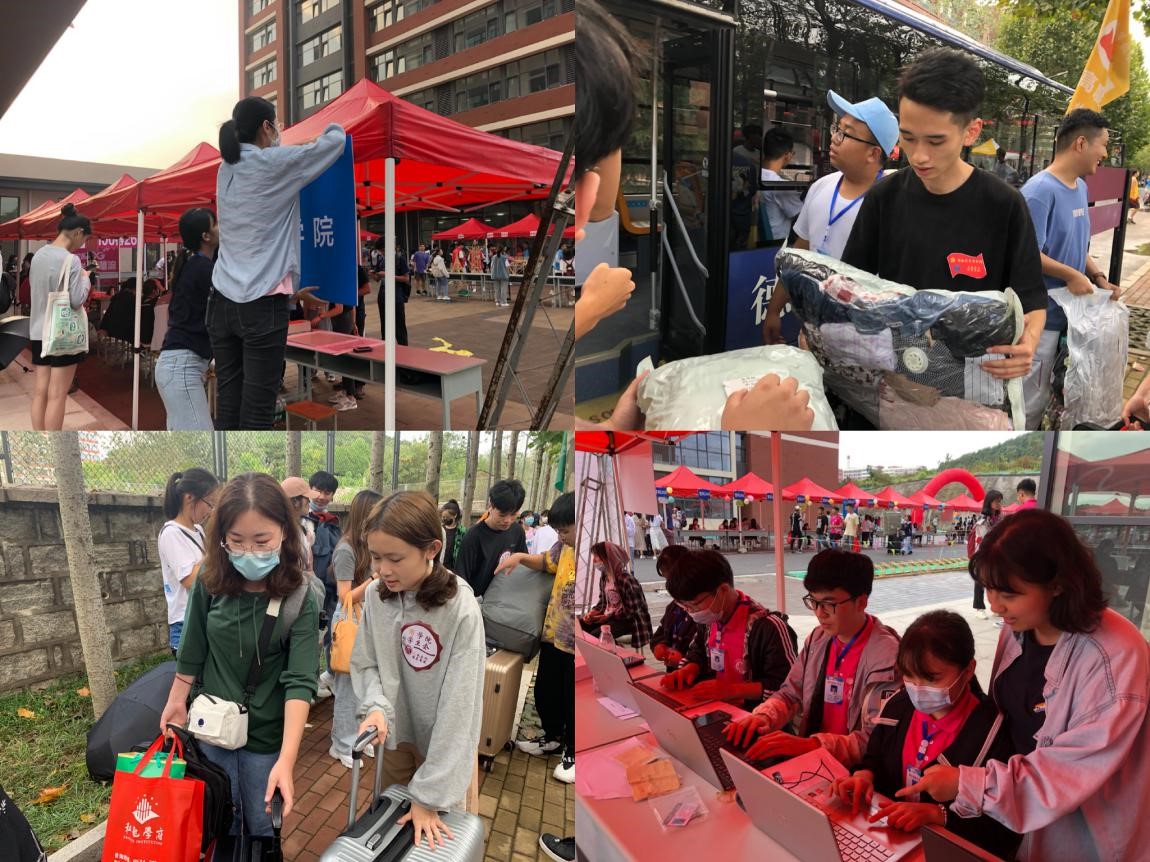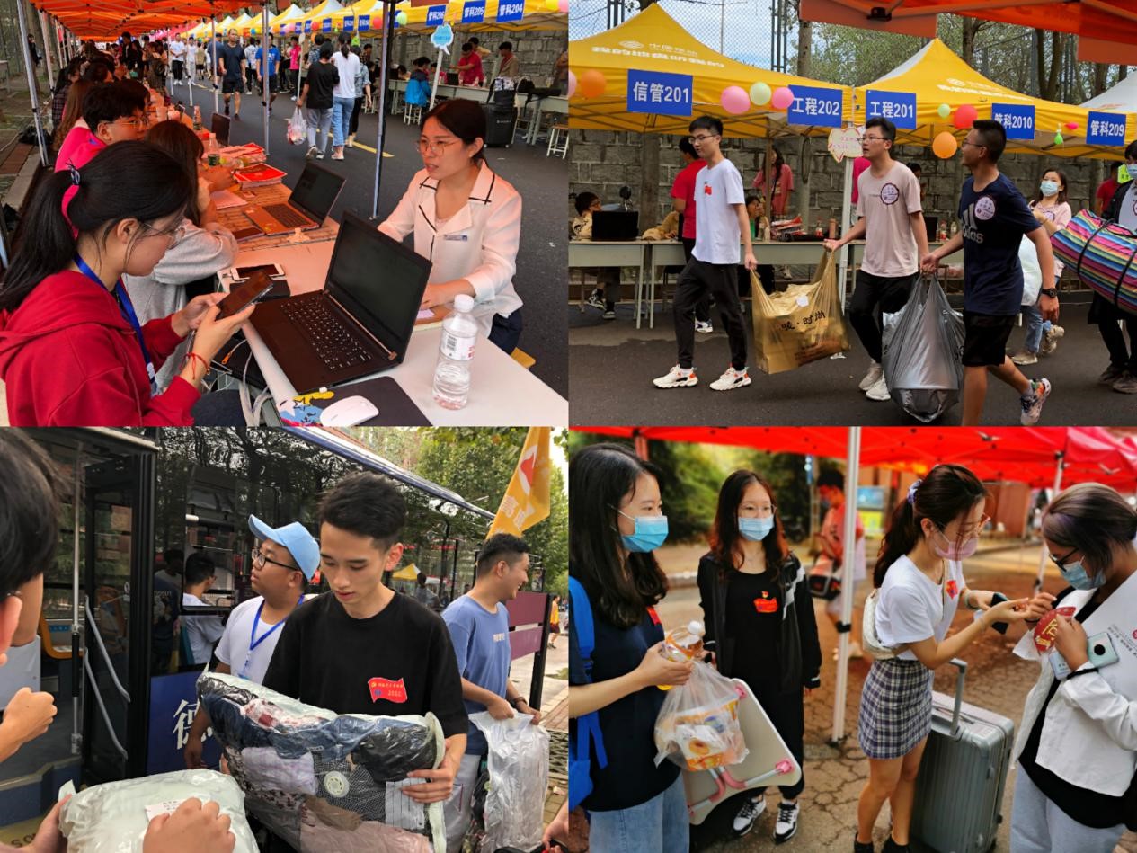清晨5:50,商学院各迎新点已人声鼎沸。他们中有佩戴辅导员卡牌的12名商学院辅导员,有佩戴党员先锋岗、预备党员考察岗的65名商学院学生党员,有佩戴入党积极分子示范岗胸贴的43名商学院入党积极分子,有佩戴商学院学生会胸贴和商学院分团委胸贴的165名志愿者,有佩戴班助证的51名新生班助和佩戴学长证的67名新生学长。商学院新生甫一入校,便有学生党员为他们贴上新生标识贴,志愿者则接过新生行李,在辅导员老师的指挥下引导新生登上公交车,下车后,又有志愿者带其去往新生报到点,由新生班助为他们办理报道事宜。辅导员、学生党员、新生班助、志愿者、新生彼此之间虽然并不熟悉,但商学院标识牌让他们亮明身份,将他们凝聚在一起,将他们打造成了一支迎新团队。这支迎新团队在商学院党总支的组织号召下,号令一致、配合有序地在各服务点做好新生帮助指引工作,彰显出商院老师的与商院学子青春的活力与朝气。