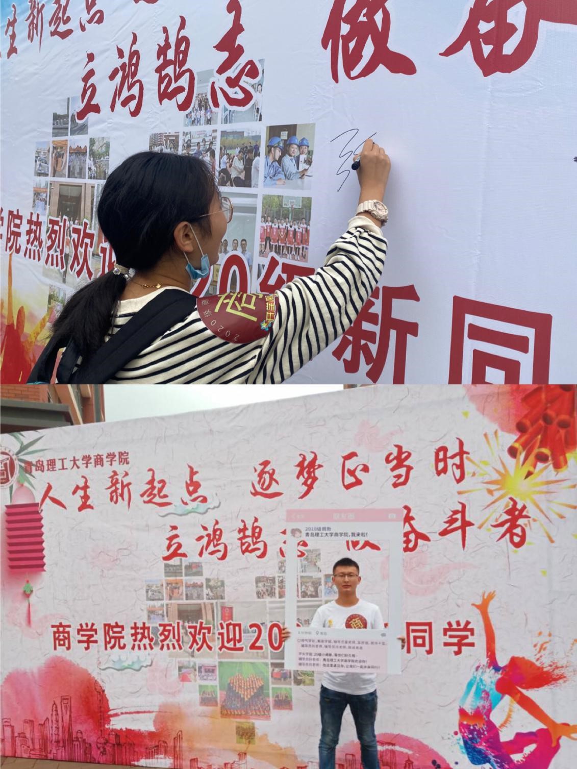 此时,一位财管专业的新生正举着商院的定制相框在迎新场地拍照。“我终于有了和青理的第一张合照!”早在“我和我的理工故事”活动中,统计203班王永钺就表示了他对青岛理工大学的向往,拍完照后,他第一时间将照片发给了父母,希望让他们能共同分享自己的喜悦。场地之外,新生们佩戴口罩有序地排队等候,虽然内心早已迫不及待,却都严格地遵守着疫情防控的要求。细微小事之中,充分体现了商院学子的自觉性和纪律性,老师也为同学们的防控安全意识感到欣慰。