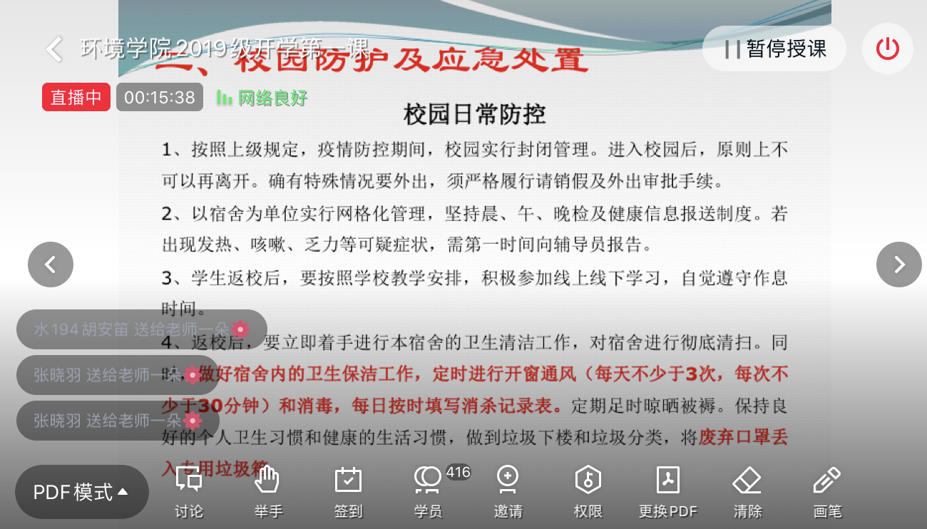 在开学第一课中,各年级、各班级等也围绕年级特点、班级特点进行了开学后重点工作的布置,2019级学生围绕“我与祖国共成长”这一主题进行了主题分享,班主任教育引导广大青少年学生更为真切地感悟伟大的民族精神、感受伟大的中国力量,不断增强民族自尊心、自信心和自豪感,为决战脱贫攻坚、决胜建成小康社会贡献青春力量。2018级辅导员李卓重点针对年级学风建设进行了分析,班主任们也就学业指导和困难生帮扶进行了摸底。2017级处于就业和考研季,辅导员花会娟围绕“大四,你准备好了吗?”召开年级会,为学生就业、考研出谋划策。研究生党支部书记胡现龙深化学生感恩教育,深挖典型事迹,广泛号召学习,引导学生奋发向上、努力拼搏的内在精神,充实校园精神文明建设内涵。本科、研究生新生前期通过线上进行了相关宣传教育,上好军训第一课,并进行系统的系列教育。