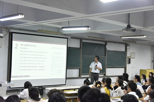 会议伊始,王鹏飞再次向新生表示了热烈欢迎,详细为新生们介绍了近期的重点安排,包括晚早操、晚自习安排,学习日程安排和注意事项,为新生调整学习、生活状态,给予了建议和指导,希望新生能尽快的融入到集体里,开始新的大学生活。随后,王少飞介绍了建筑学专业的基本情况,他首先向新生提出了两个问题:什么是建筑学?为什么要学习建筑学?通过同学们对这两个问题的回答,帮助同学们梳理建筑学专业未来就业方向和时间规划。随后,王少飞从建筑学专业的发展历史、社会需求、基本要求和专业介绍四个方向为新生进行了细致入微的讲解,同时还介绍了近几年建筑与城乡规划学院发展状况和未来前景。最后,王少飞从专业特色、师资力量、未来就业方向及合作产业等方面对新生学习与发展作出指导,鼓励同学们要志存高远、有所作为,并寄语广大2020级新同学,奋发图强、刻苦学习励志成才、努力奉献,为学院、学校乃至国家民族的发展贡献力量。