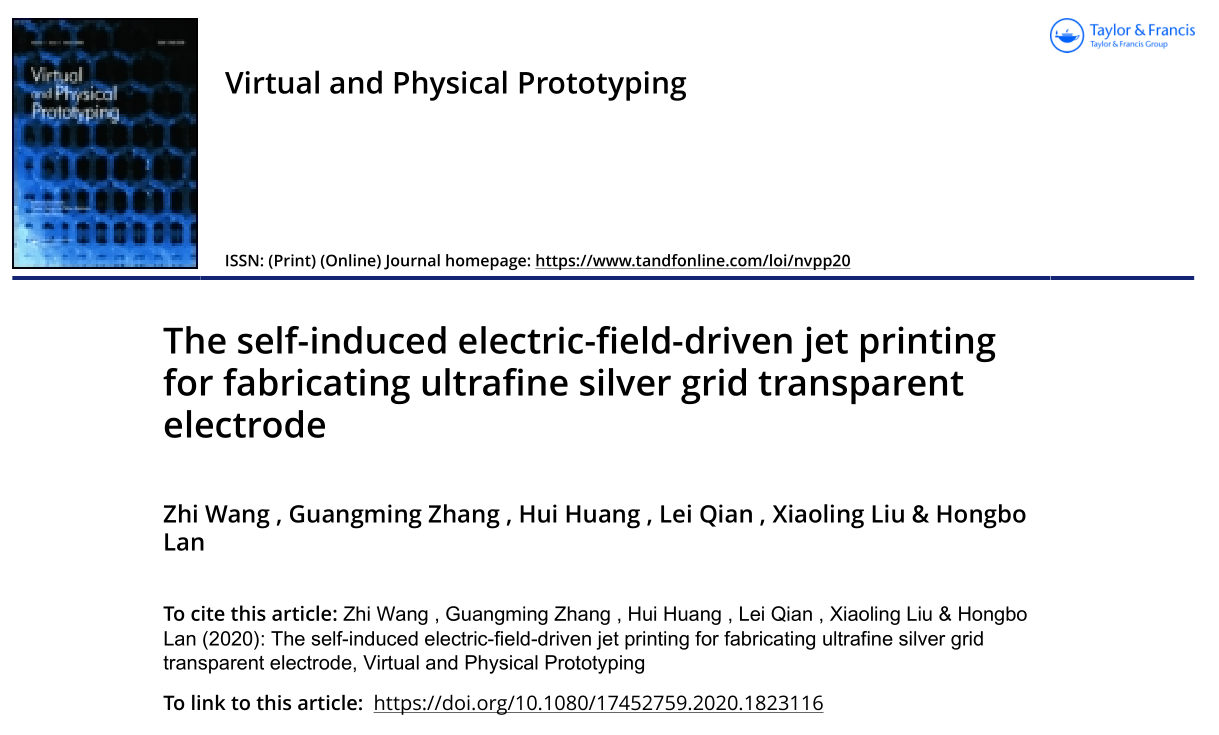 近日,机械与汽车工程学院、山东省增材制造工程技术研究中心的机械工程专业2018级研究生王智以第一作者、青岛理工大学第一单位在国际权威期刊《Virtual and Physical Prototyping》发表题为《The self-induced electric-field-driven jet printing for fabricating ultrafine silver grid transparent electrode》的研究论文,指导教师为张广明副教授。