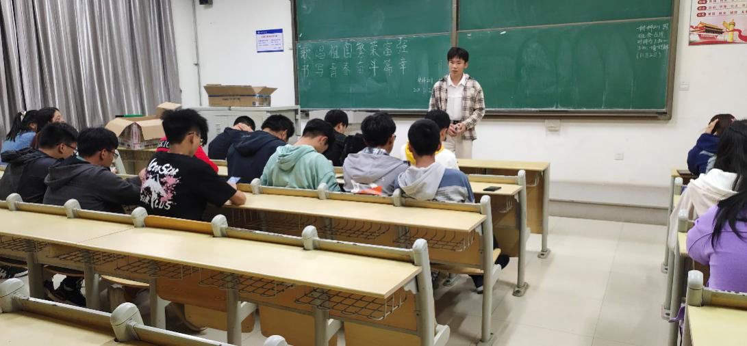 材科201班团支书佘晓宇带领全班同学集体合唱《我和我的祖国》,向全体同学发出倡议,青年要有青年应有的风貌,青年也应在祖国走向伟大复兴的路上留下浓墨重彩的一笔。青年应时刻具有奋斗精神,准备为祖国贡献自己的一份力量。