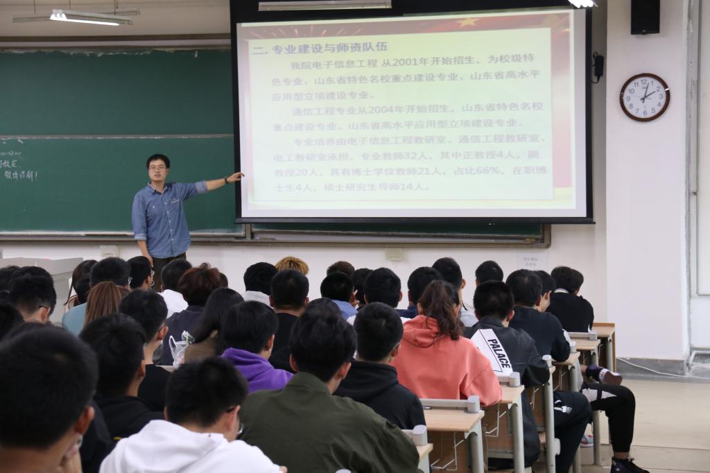 为帮助学生适应大学生活,坚定专业思想,养成良好的学习风尚,信息与控制工程学院通信工程教研室、电子信息工程教研室联合英谷教育,就专业培养、职业规划、学生管理等面向239位新生,在嘉陵江路校区主教学楼B333和B335分两个会场开展专业大会教育。英谷教育王万琦,通信工程教研室主任王绪虎,专业教师禚钊、周立俭,辅导员孙海英参加大会。