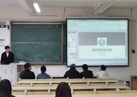 学院国家奖学金、省政府奖学金评选经学生个人申报、学院初审,择优推选了8名候选人进行答辩。答辩会分为个人PPT展示和现场提问两个环节。参选同学按抽签顺序依次上台答辩,就课程学业、科研学术成果、文体竞赛、个人经历、自身优势等方面进行5分钟的汇报,评委根据展示内容进行了现场提问。