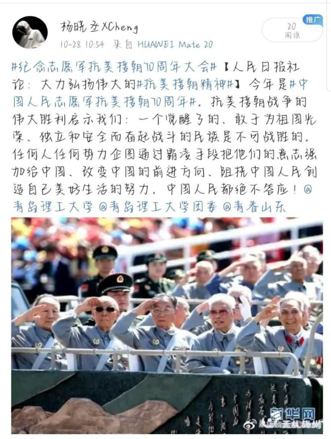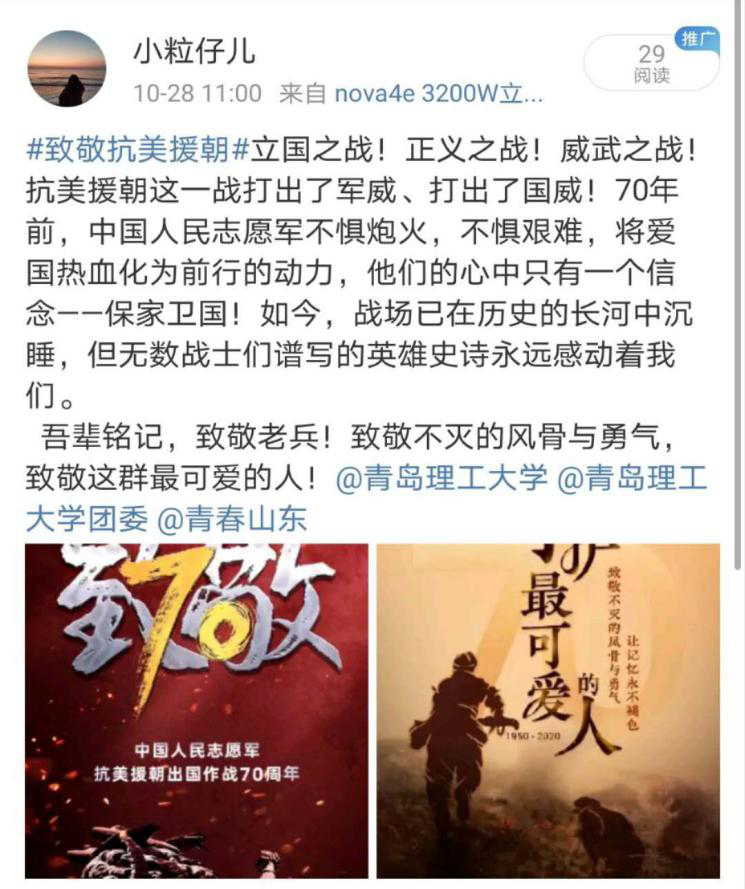 争做时代新人,积极微博互动:商学院学生积极参与微博#致敬抗美援朝#话题互动,抒发所思所想,展现学院共青团员学习伟大的抗美援朝精神,争做时代新人,担当起民族复兴重任的良好风貌。