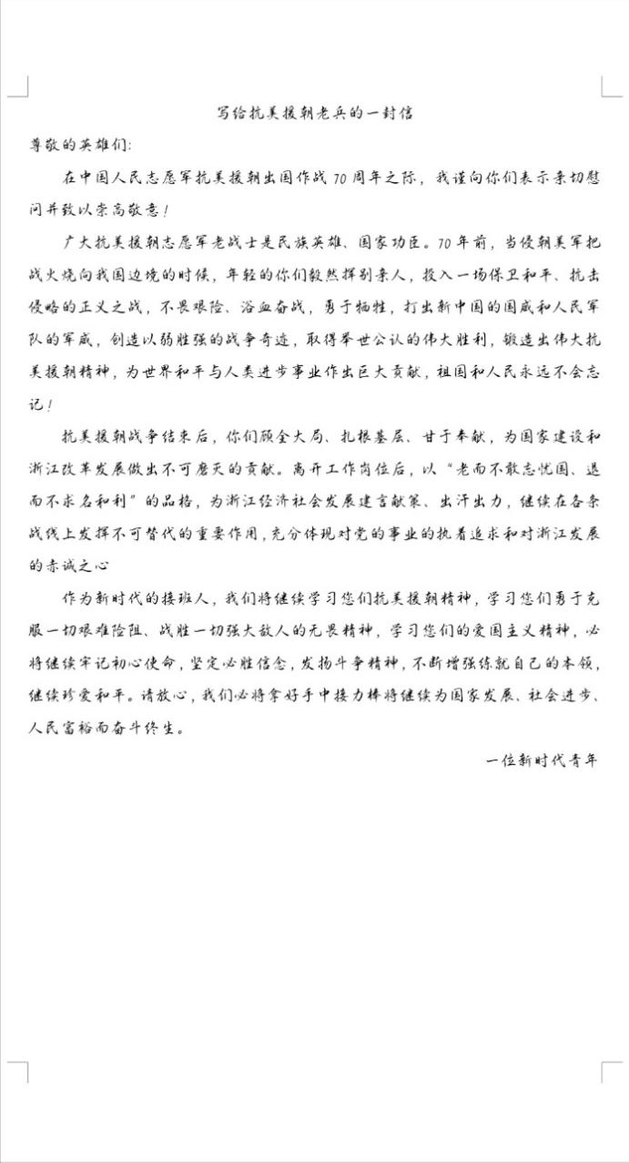 致敬英雄老兵,书信传心寄情:抗美援朝的老兵是国家的英雄,他们的付出换来了如今安定的生活环境,作为当代新青年的我们,必须牢记前辈们的付出。财管181班赵秀清和李甜甜同学以书信形式,文字随心,笔尖传情,动情的描述道:“这是一场新中国的立国战,是一场粉碎战,是一场用生命严守中国的边境战!是你们的奋战艰辛,在朝鲜的冬天,冰天雪地里,在这样恶劣的环境下凭借着高度的爱国精神,顽强的意志一直向前。”