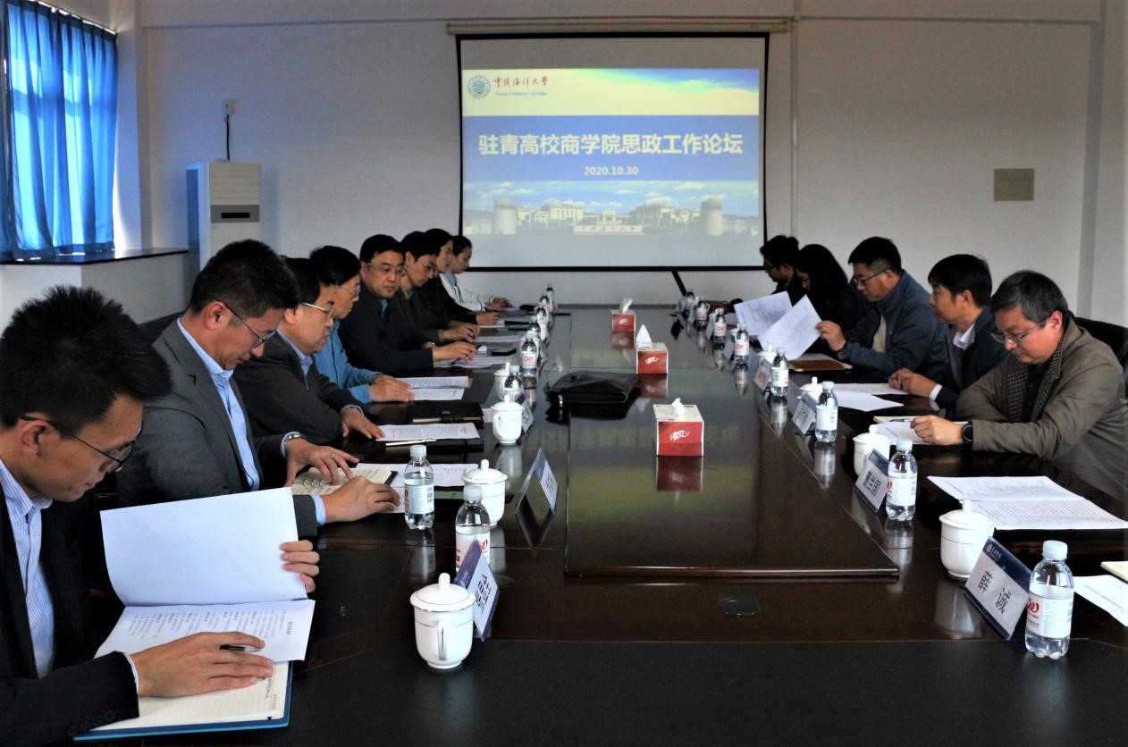 与会单位就建立驻青高校商学院思政工作联盟进行商讨,一致同意成立驻青高校商学院思政工作联盟,审议通过了联盟章程,并推选中国海洋大学管理学院作为首任轮值理事单位。