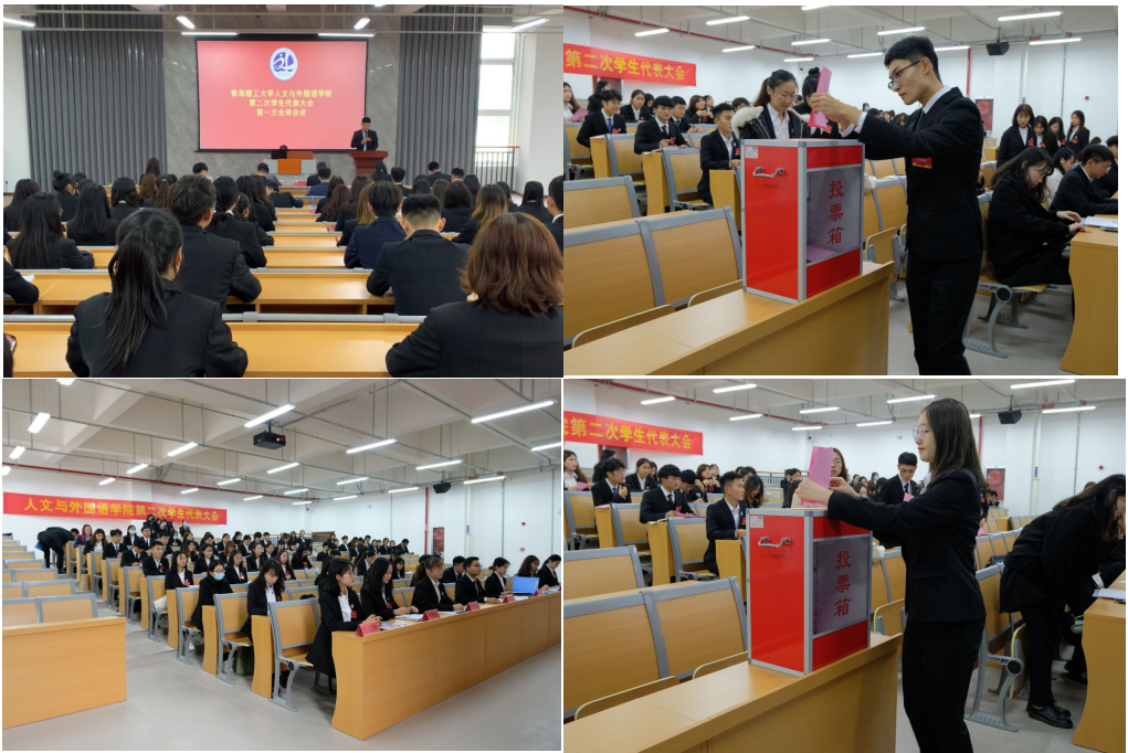 通过人文与外国语学院第二届学生会主席团成员、出席青岛理工大学第十一次学生代表大会代表候选人名单,提交各代表团酝酿结果。大会选举工作在总监票人和3名监票人的全程监督下进行,55名学生代表依次进行不记名投票,在严格的选举程序下正式选举产生人文与外国语学院第二届学生会主席团成员。总监票人公布计票结果,刘太超、杨旭、于欣楠当选人文与外国语学院第二届学生会主席团成员。选举现场井然有序,氛围严谨。